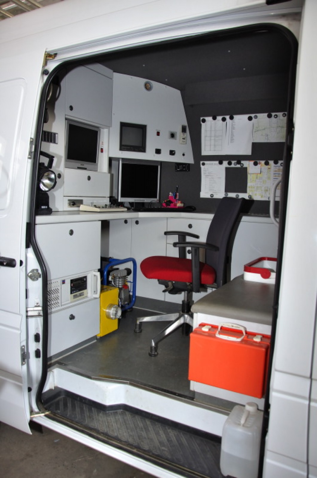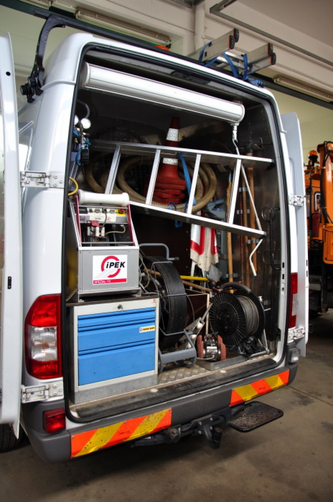 Die notwendigen Werkzeuge, Ersatzteile, Sicherheitsausrüstung, Kamerazubehör und die steuerbare Kabeltrommel befinden sich im hinteren Teil des Fahrzeuges. Die vor Ort aufgenommenen Kanalinspektionsdaten werden nach der Rückkehr zum Betriebsgebäude auf den Server überspielt. In weiterer Folge wird die Auswertung der Inspektionsdaten vorgenommen und die entsprechende Sanierung in Abhängigkeit von der Schadensart in Auftrag gegeben.